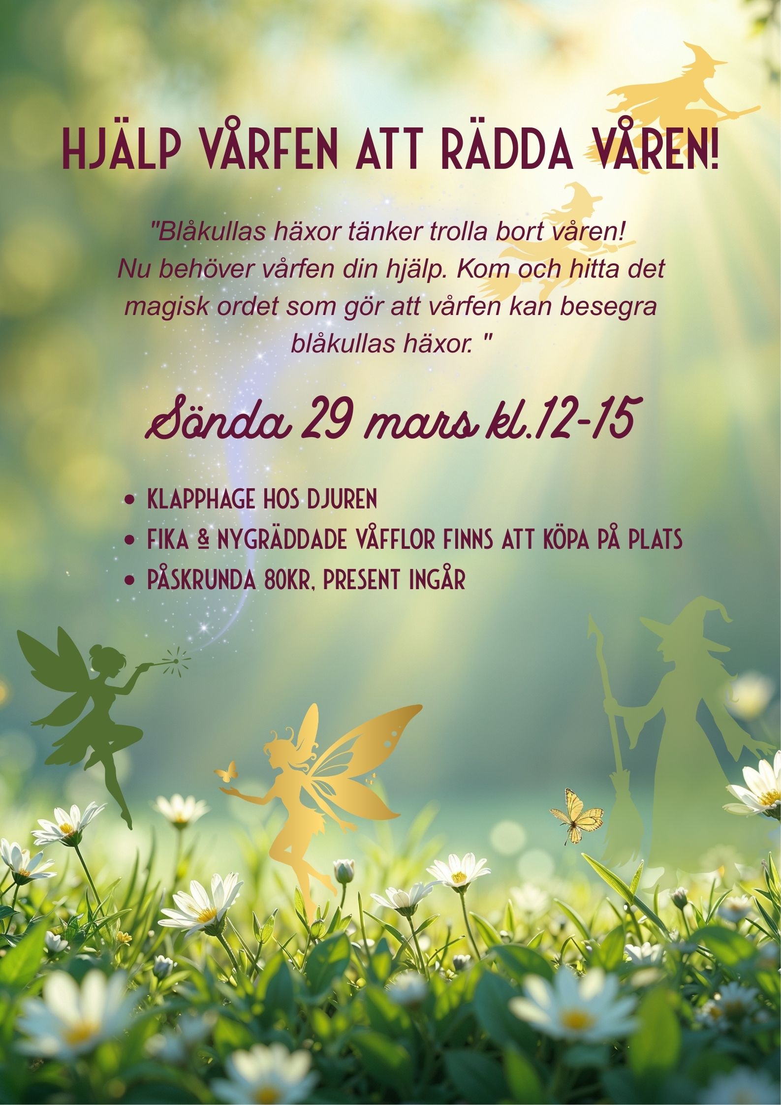 ”Blåkullas häxor tänker trolla bort våren, nu behöver vårfén din hjälp. Kom och hitta det magiska ordet som gör att vårfén kan besegra blåkullas häxor. ”