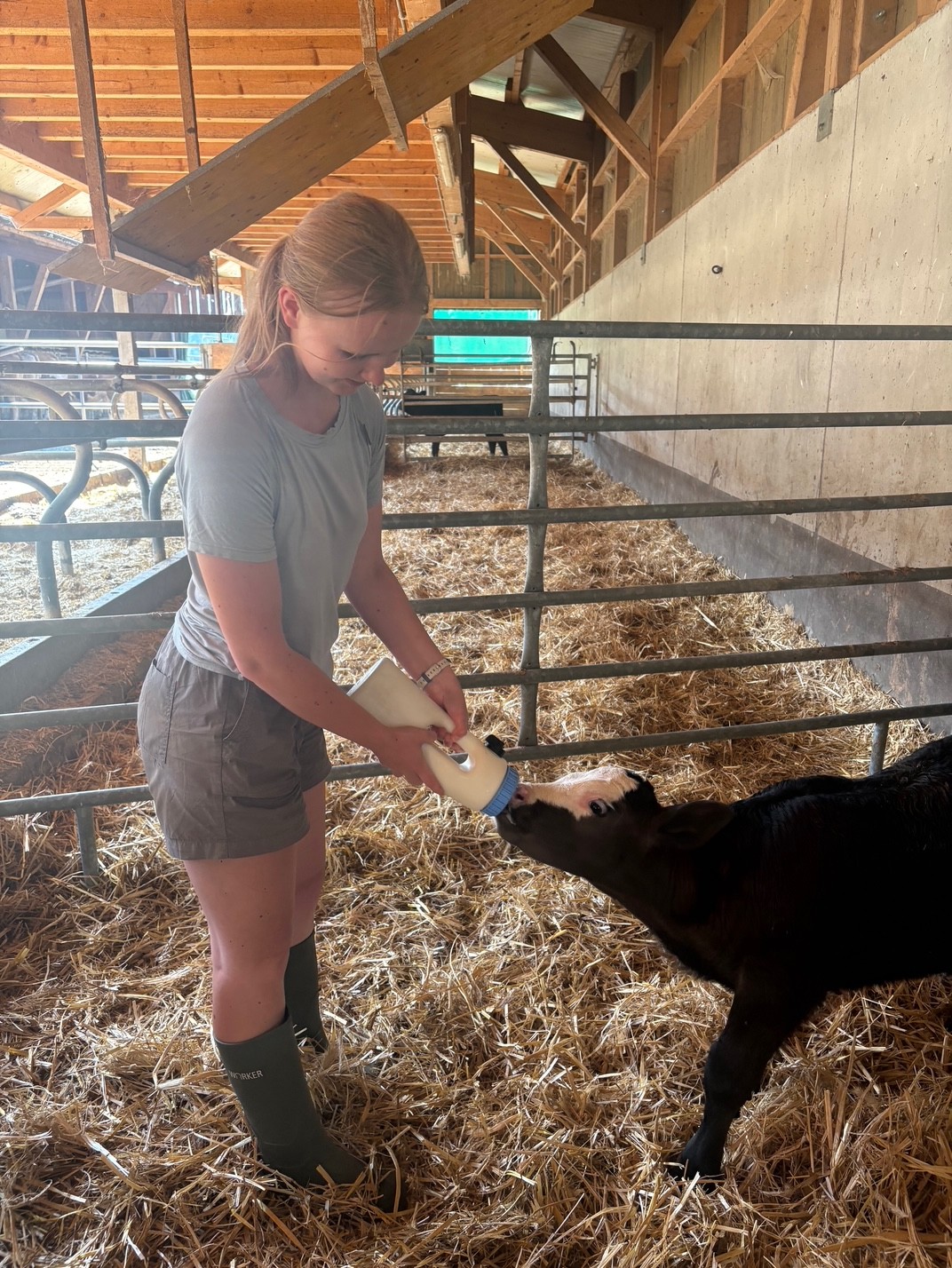 Min andra värdfamilj hade en liten ekologisk gård för dikoproduktion och även här var jag i fyra veckor. Här fanns runt 22 kor då de andra spenderar sommaren på bete i Alperna. Vi hade också höns, ankor, gäss, en hund och en liten odling av blommor, grönsaker, potatis och bär. Här ”fick” jag en egen kalv som jag skulle koppelträna och få tam, något de gör med alla sina kalvar då de blir lättare att hantera som vuxna sen. Jag fick även vara med under en födsel, min värdsyster väckte mig 01.00 och en halvtimme senare kom den lilla kalven. Jag fick se hennes första steg, första måltid och sen fick jag ansvaret att träna henne också. Vi gick promenader med korna varje dag när de skulle in och ut ur hagen och jag fick även vara med och uppfostra årets flock av gäss. Här fick jag också lära mig göra massa klassiska schweiziska bakverk och maträtter vilket var väldigt intressant. När vi inte höll på med djuren eller i köket så tog de med mig till en massa ställen; en ekologisk äggproduktionsgård, Europas största vattenfall, ett slott och massa annat kul!