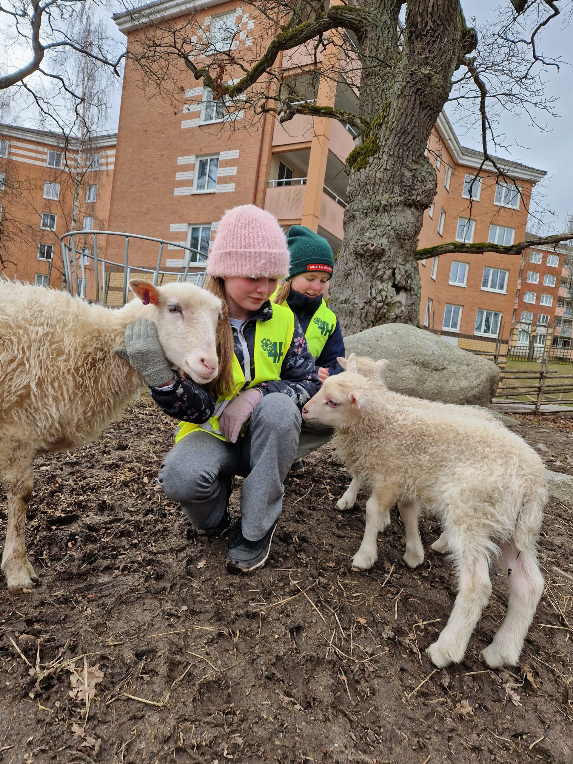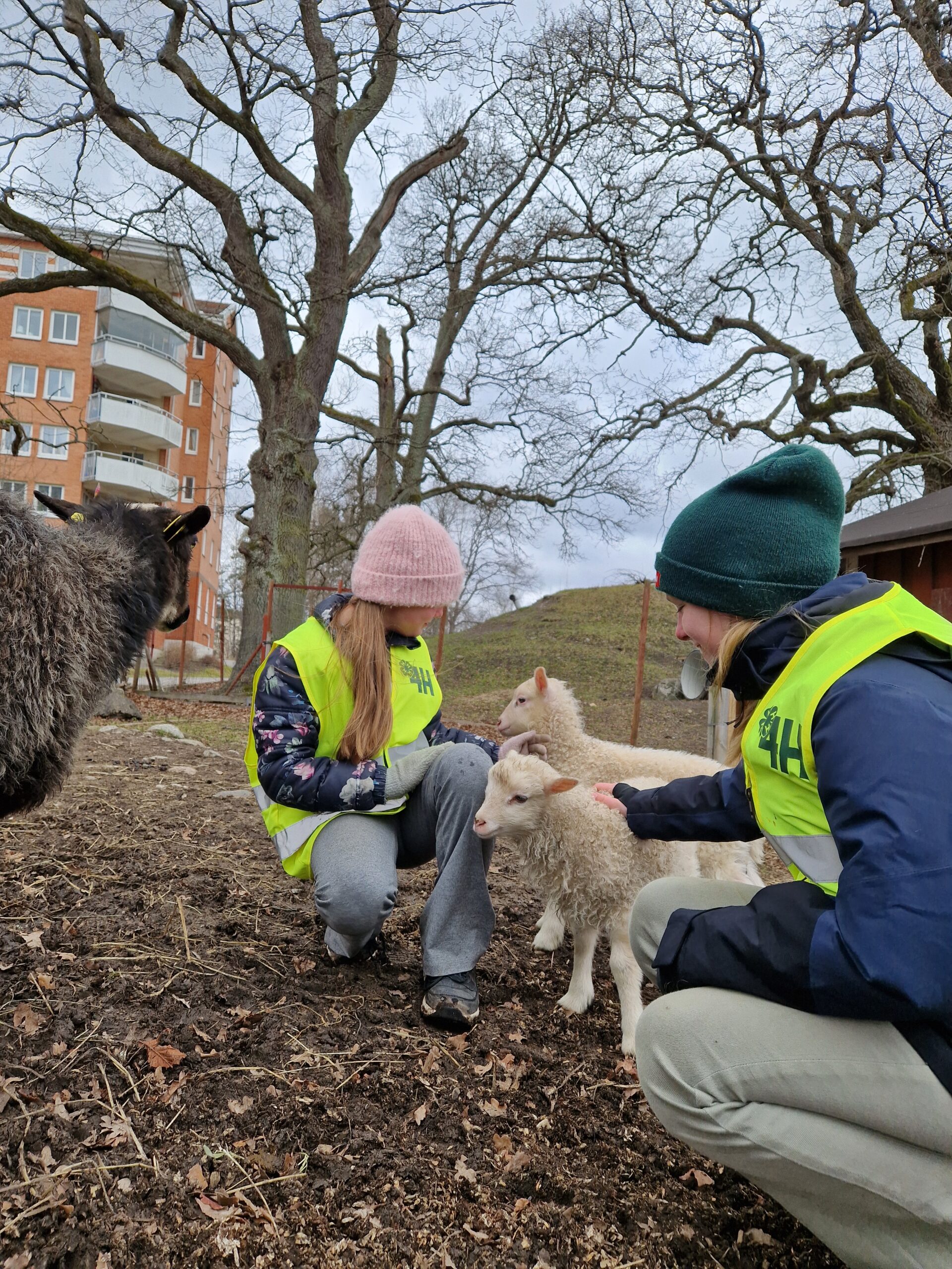 Ella, Lux och Senna kommer ofta och hälsar på besökare vid staketet och tycker verkligen om att bli klappade. De sover i det lilla huset intill fårhagen.