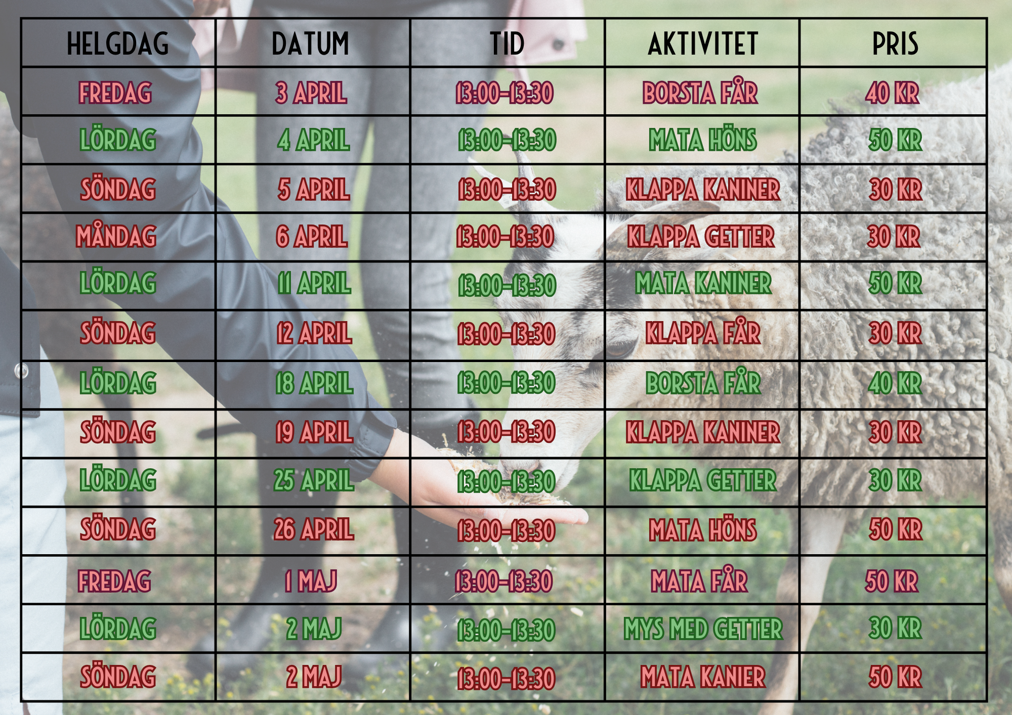 På helgerna har du som besökare möjlighet att komma nära djuren tillsammans med vår personal. En perfekt utflykt för hela familjen! Under våra helgaktivteter gäller drop in – ingen föranmälan krävs.